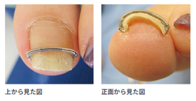 コイルばねに内蔵された超弾力性合金ワイヤーの弾性力によって、矯正具を装着している間に爪の湾曲が徐々に矯正されます。