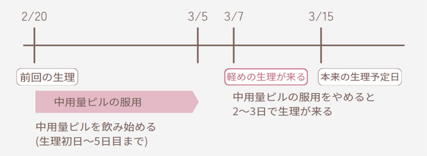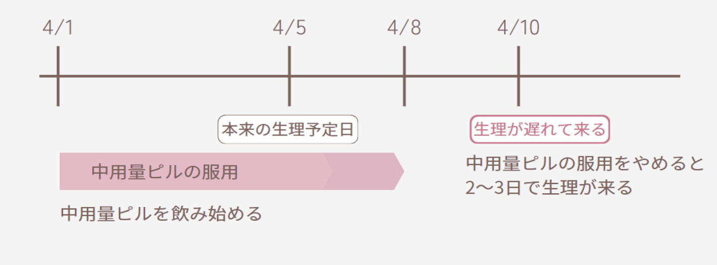 本来の月経予定日が4/5であり、4/8までは月経が来ないよう遅らせる場合の例です。中用量ピルの内服をやめると、2~3日で月経が来ます。