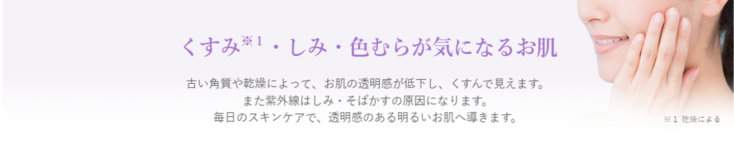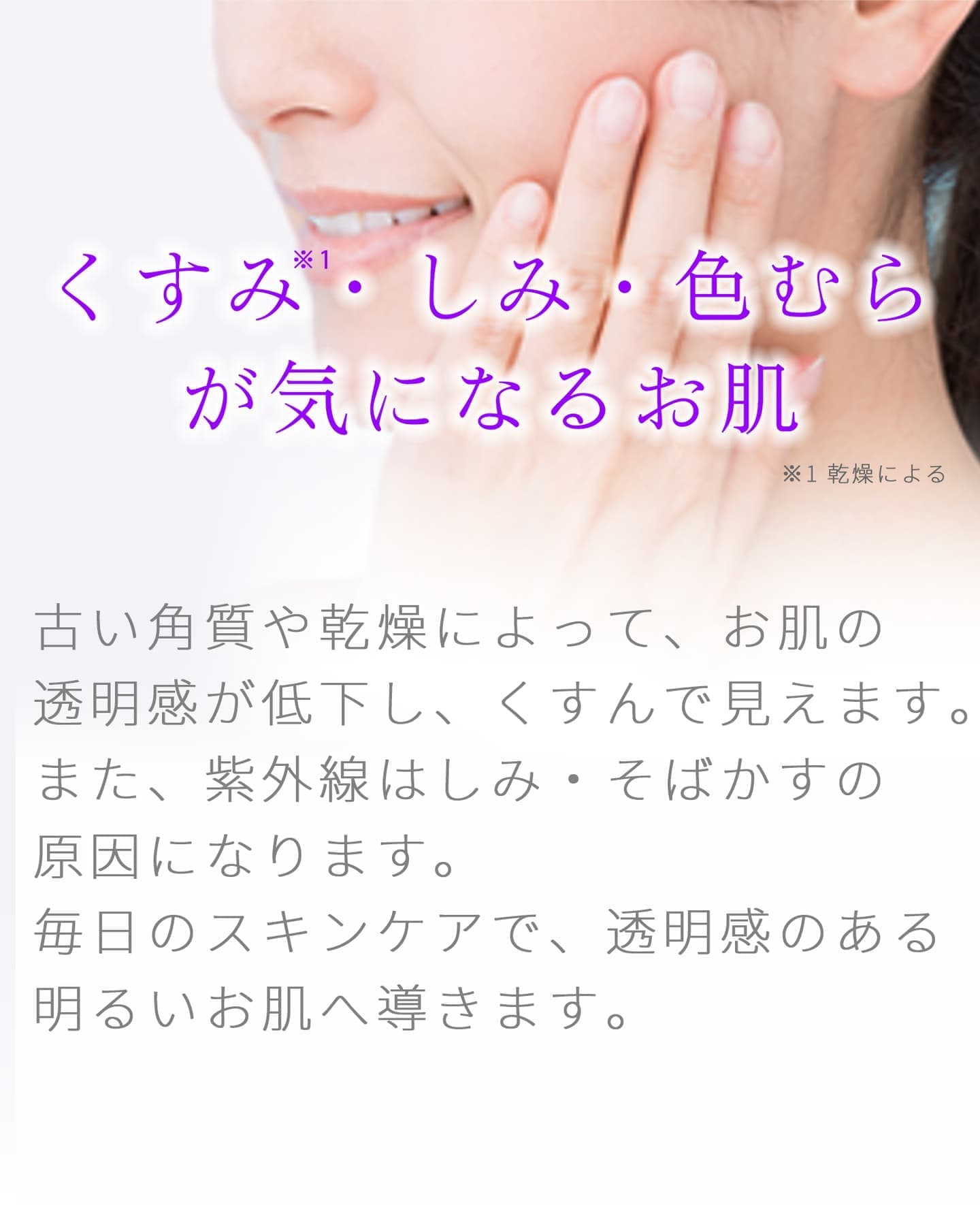 マイルドピーリング作用で古い角質を取り除き、くすみやざらつきが気になるお肌を、やわらかく透明感のあるお肌に導きます。また角質の状態をととのえて、次に使う化粧品のなじみやすくします。